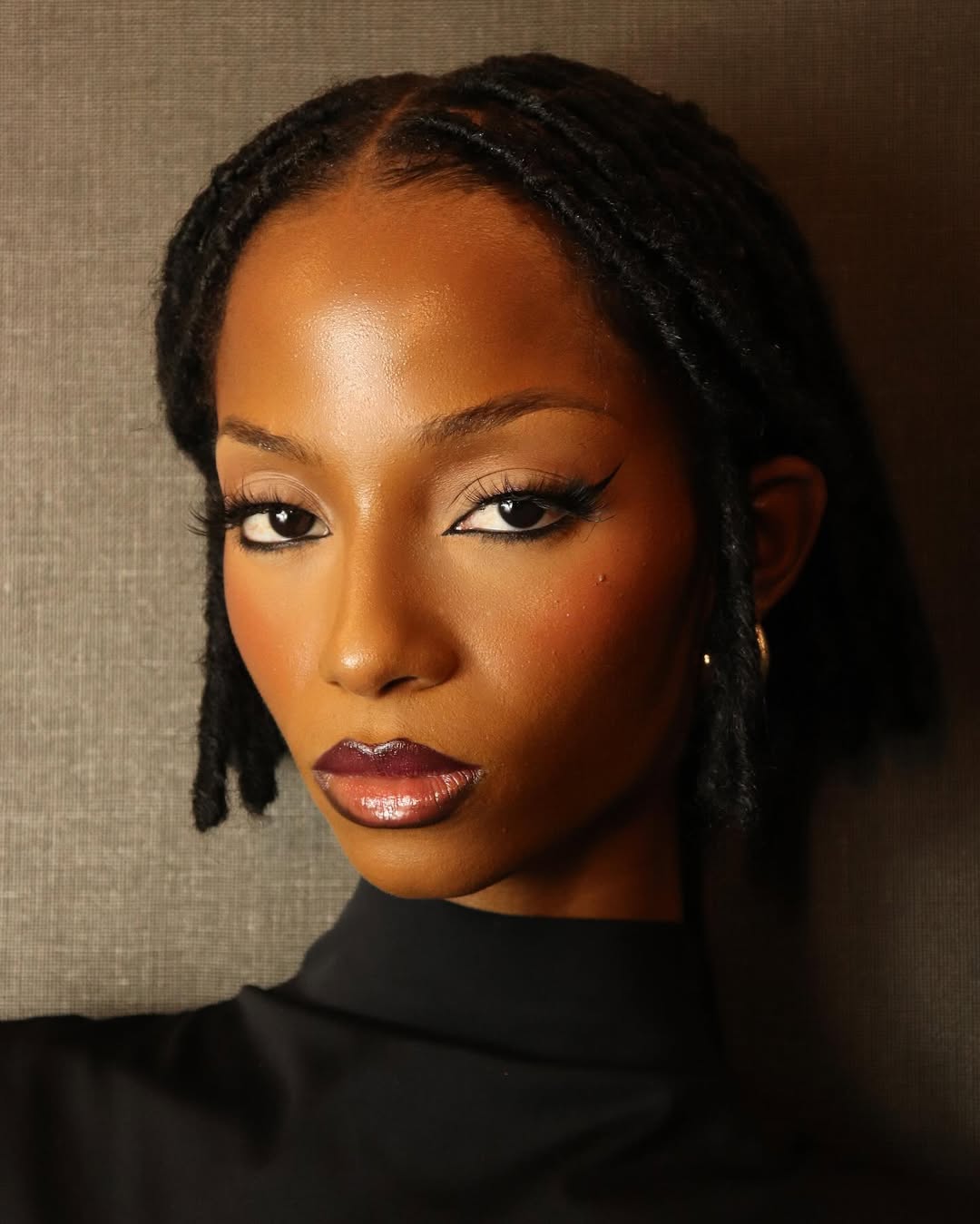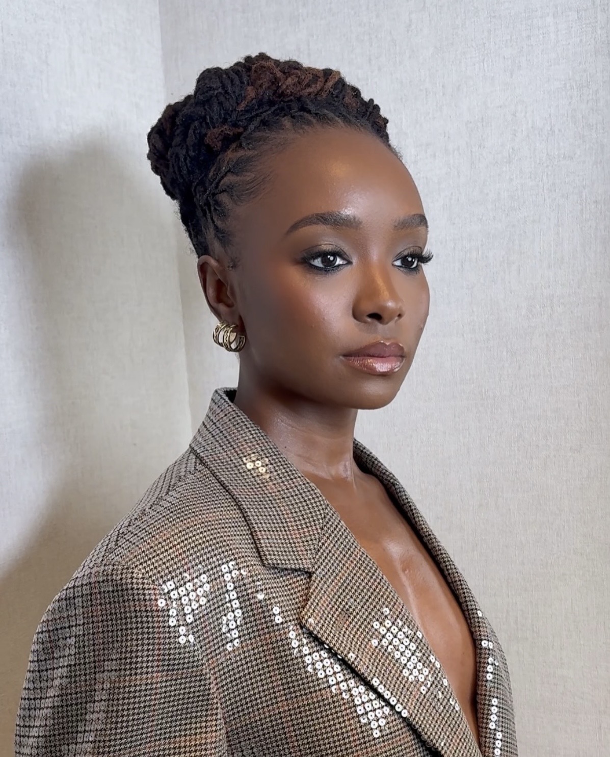 This style instantly frames the face and draws attention upward, making it ideal for both casual days and more elevated settings. A sleek updo, with well-laid edges, gathers locs neatly at the crown, creating a clean silhouette that looks polished without feeling overdone.
